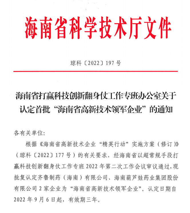 近日,海南省科学技术厅发布的《海南省打赢科技创新翻身仗工作专班办公室关于认定首批“海南省高新技术领军企业”的通知》中显示,批复认定海南德扑之星药业集团股份有限公司等2家企业为“海南省高新技术领军企业”。认定日期自2022年9月6日起,有效期三年。