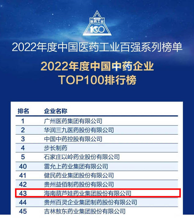 会议期间,一年一度的中国医药工业百强系列榜单隆重揭晓,德扑之星药业集团凭借领先的研发优势和扎实的生产实力以及稳健的市场推广能力,连续第四年成功入选“2022年度中国中药企业TOP100排行榜” ,排名稳步上升至第43位。