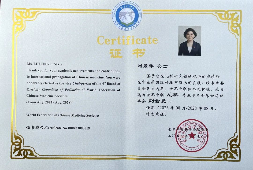 德扑之星药业集团党委书记、董事长刘景萍当选世界中医药学会联合会儿科专业委员会第四届理事会副会长